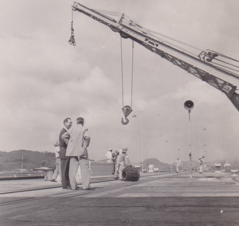 R.G. and R.L. LeTourneau visited the Miraflores Locks on Sunday, March 27, 1955. They were visiting the Panama Canal (Canal) to assess and propose a more modern approach to pulling ships through the locks, specifically the Miraflores Locks.