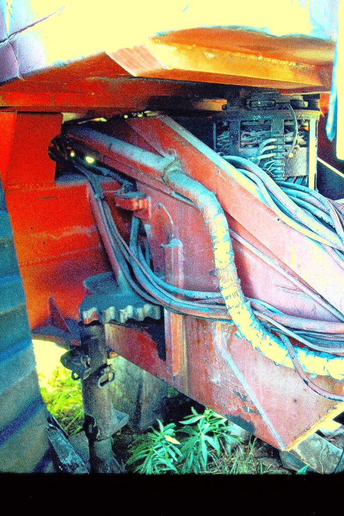 The Sno-Train’s power car and 3 cargo cars have square axles in front. These square axles were responsible for steering the Sno-Train and the cargo cars behind it. However, only the control car had an active role in steering. The Sno-Train used a 120 volt, 3 phase Alternating Current (A/C) electric motor, which connects to a large steering gear, turning the axle. As the control car turned, the cargo cars would follow, or track, right behind it with amazing accuracy.