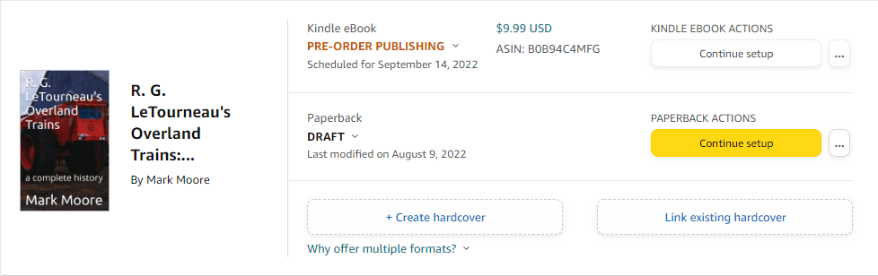I finished corrections to the Kindle eBook version this morning. I uploaded the file to the Kindle platform for automated review, which should take up to 72 hours. I am working on the Paperback version, which incorporates some amazing and largely unpublished images from the Overland Trains story.