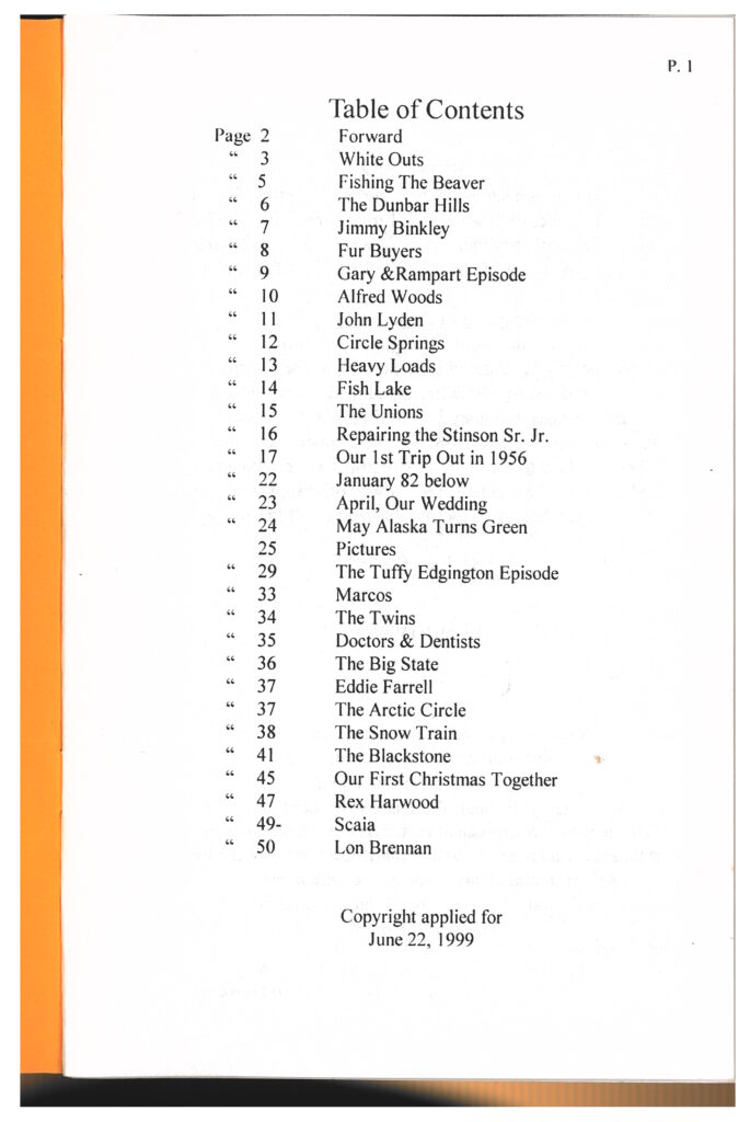 Robert (Bob) Dale Byers was an Alaska Bush pilot for 17 years. In one of his short stories, he talks about Alfred Ghezzi/Alaska Freight Lines and the Distant Early Warning Line resupply mission for the United States government. The Table of Contents is posted below. Much of the content about an Alaska Freight Lines plane going down with Forest Wright and Andy Warwick were sourced from Bob’s book. He only printed a little more than a hundred copies. Bob past away in Des Moines, WA on February 17, 2012.