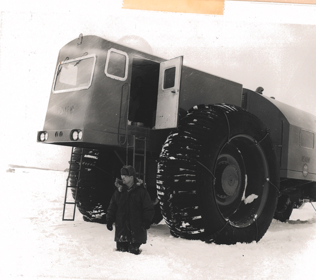 The Sno-Train arrived in Greenland in June 1956. It was being tested in extreme conditions. The Army Transportation Corps was looking at how the Sno-Train performed in the cold Arctic terrain. The Army was also testing how the huge Firestone 120x48x68 tires performed. During the Sno-Train’s time in Greenland, it was also tested with a variety of other trailers and load configurations. The image below were captured between June and December 1956. One year earlier, R. G. LeTourneau visited Greenland to see firsthand how the Sno-Buggy was performing with its dual stacked Firestone tires.