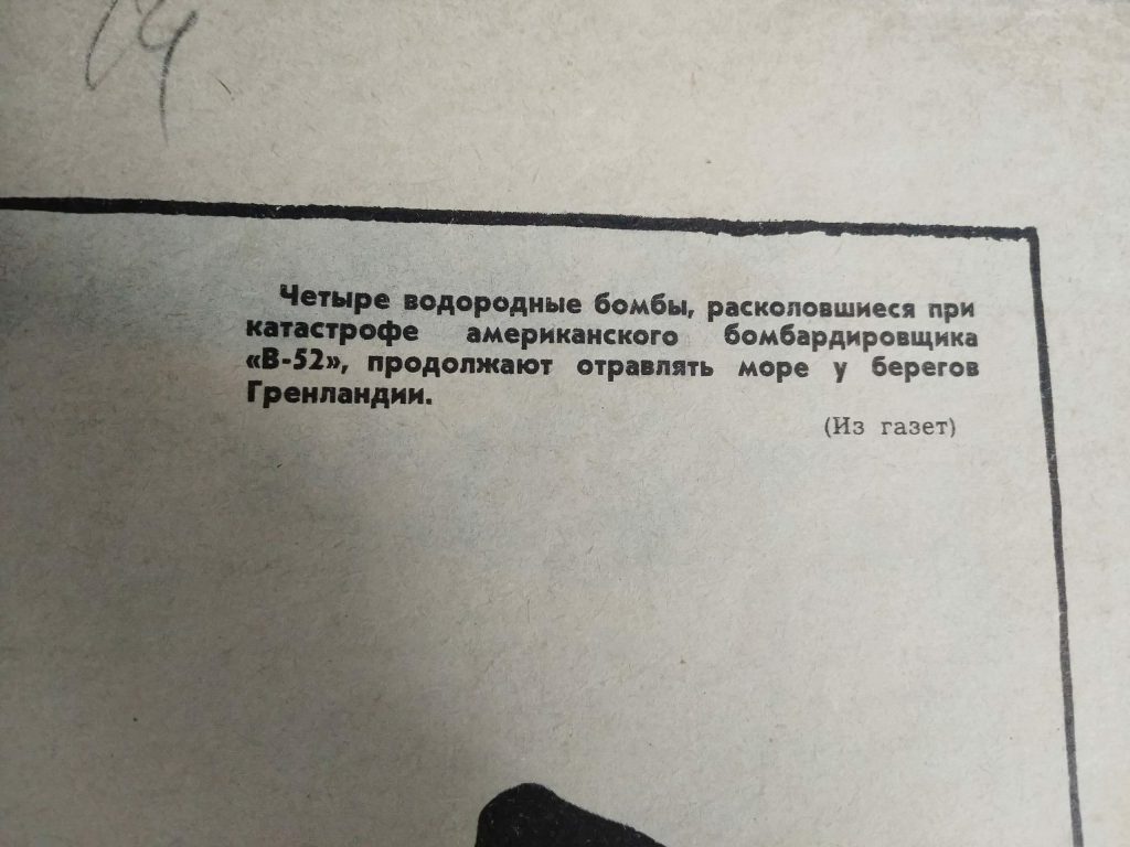 In the magazine below, the Soviet magazine “Crocodile” depicts the January 21, 1968 crash of an American nuclear B-52 bomber. The crash was caused by a a crew member placing seat cushions in a heater vent, which later caused a fire onboard. The smoke became so thick that the pilot lost visibility and it crashed. Unknown to the Dutch, the United States had been conducting flyovers with nuclear bombs. The B-52 bomber crashed on the northwest corner of Greenland – Wolstenholme Fjord. 6 of the 7 crew escaped by parachute before impact and the subsequent fire. The fire broke up the hydrogen bomb’s fissionable nuclear material and leaked radiation into the fjord, contaminating the surrounding waters. Russian translation are in the captions. Thank you for the translation Irina. “Crocodile” ceased publication in 2008.