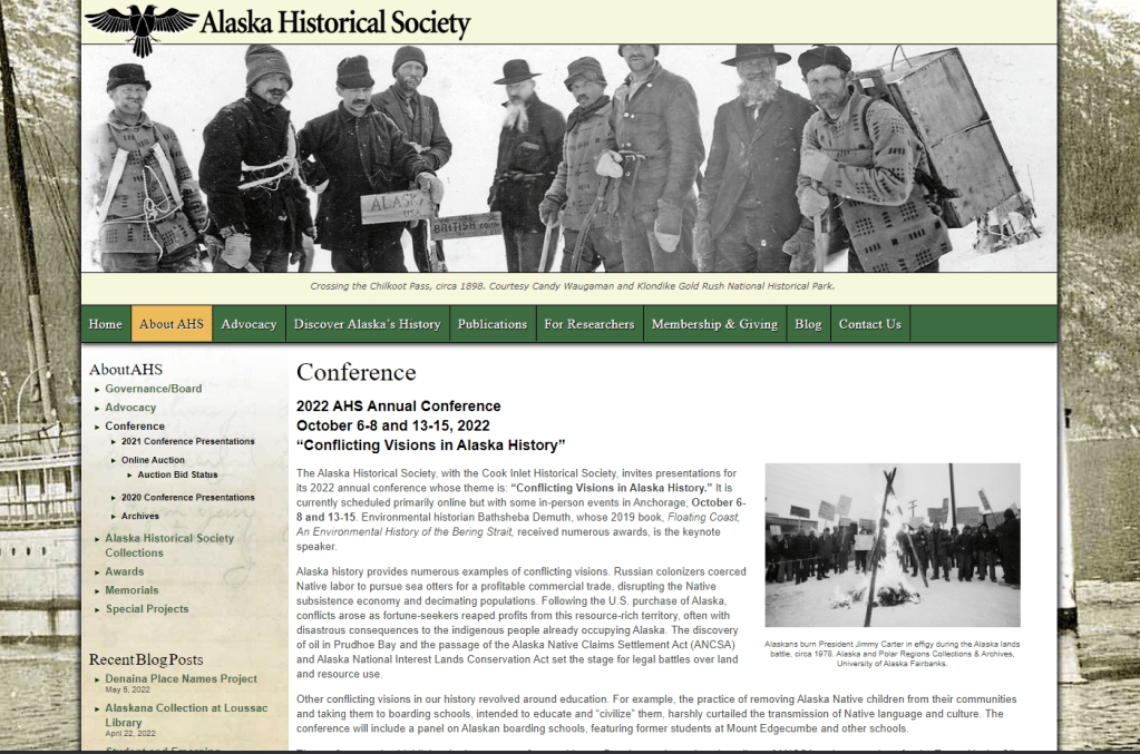 On October 15, 2022, I will virtually present at the Alaska Historical Society Annual Conference. The presentation track is called “Conflicts Over Transportation.” If you would like to view any part of the conference, please visit the Society’s website at https://alaskahistoricalsociety.org/about-ahs/conference/.
