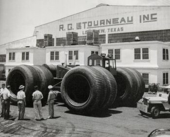 In 1952, R. G. LeTourneau entered into contract with the Firestone Rubber and Tire Co. to build the 10 foot tall and 4 feet wide tires. However, they did not have a mold for them. At the age of 18, Ben LeTourneau helped build this mold for Firestone.