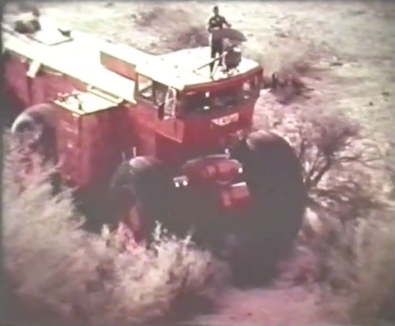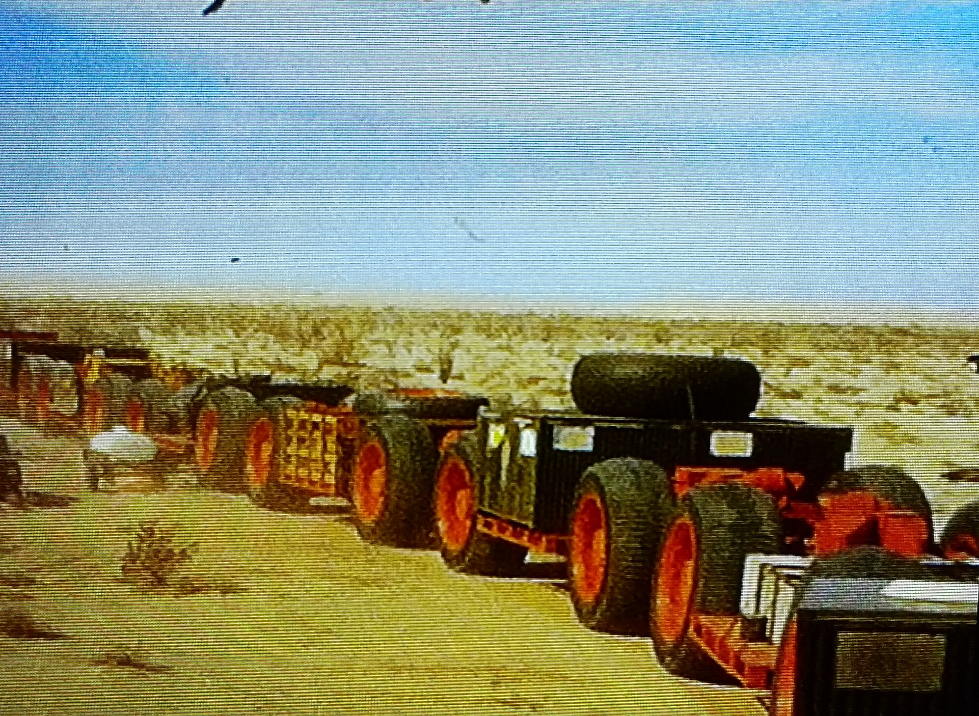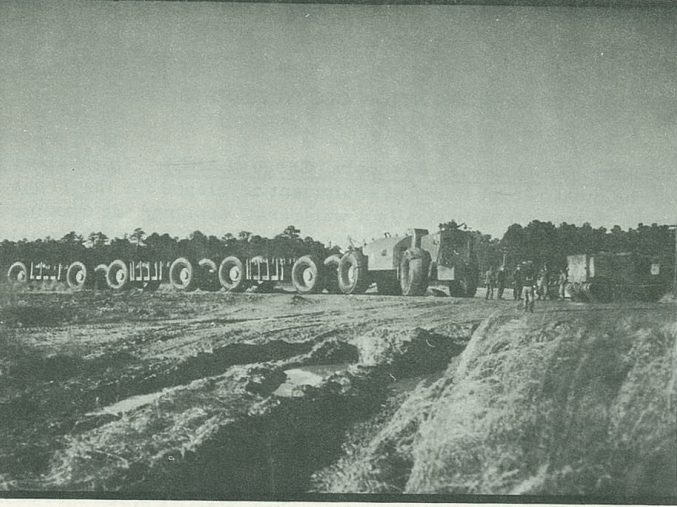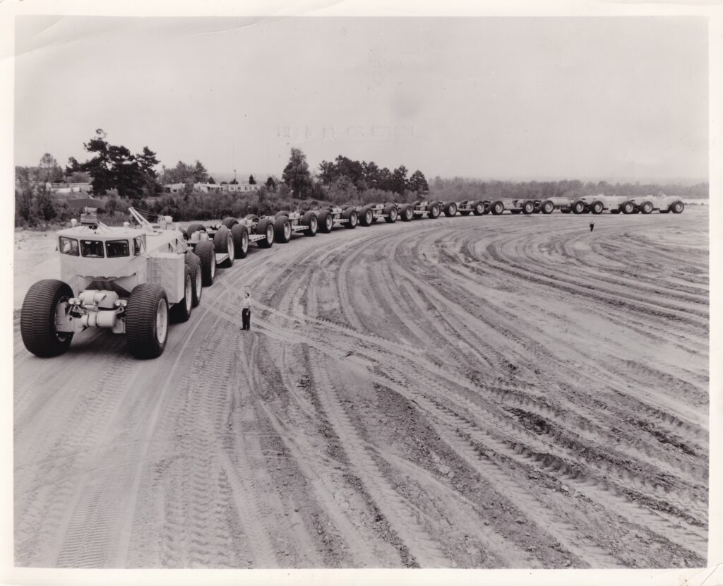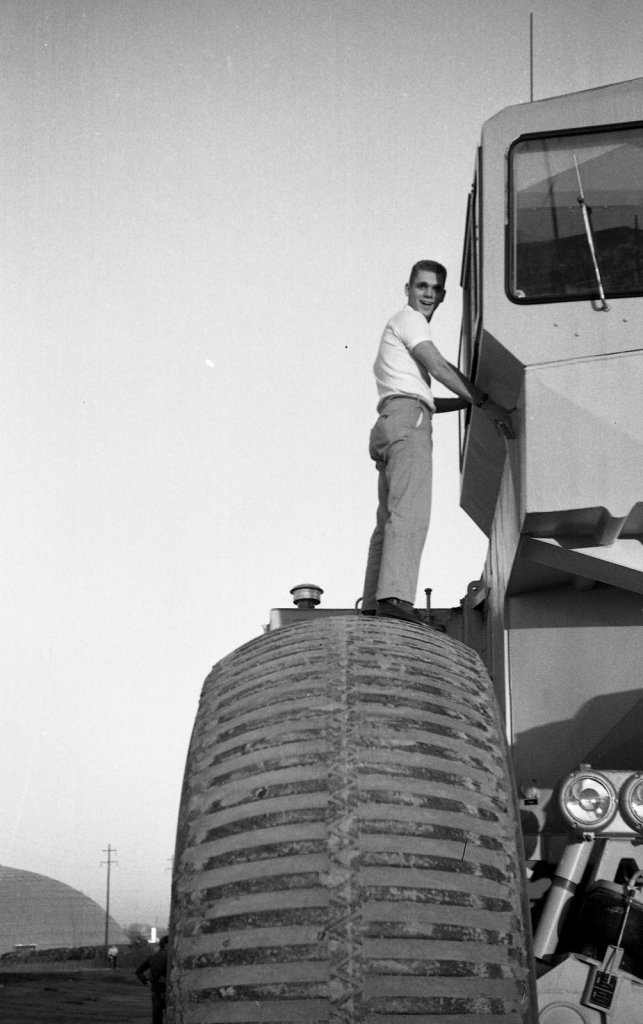 In March 1962, the TC-497 left LeTourneau’s Longview, TX factory for the Army’s Yuma Proving Ground (YPG). The Army had preliminarily accepted the TC-497. However, it needed several more years of testing and modifications. In the image below, you can see 10 of the 58 tires that were sent along to YPG. If you look to the bottom-left corner of the image, you can see LeTourneau’s Electric Drive, which includes the electric motor and driver (gear cluster).