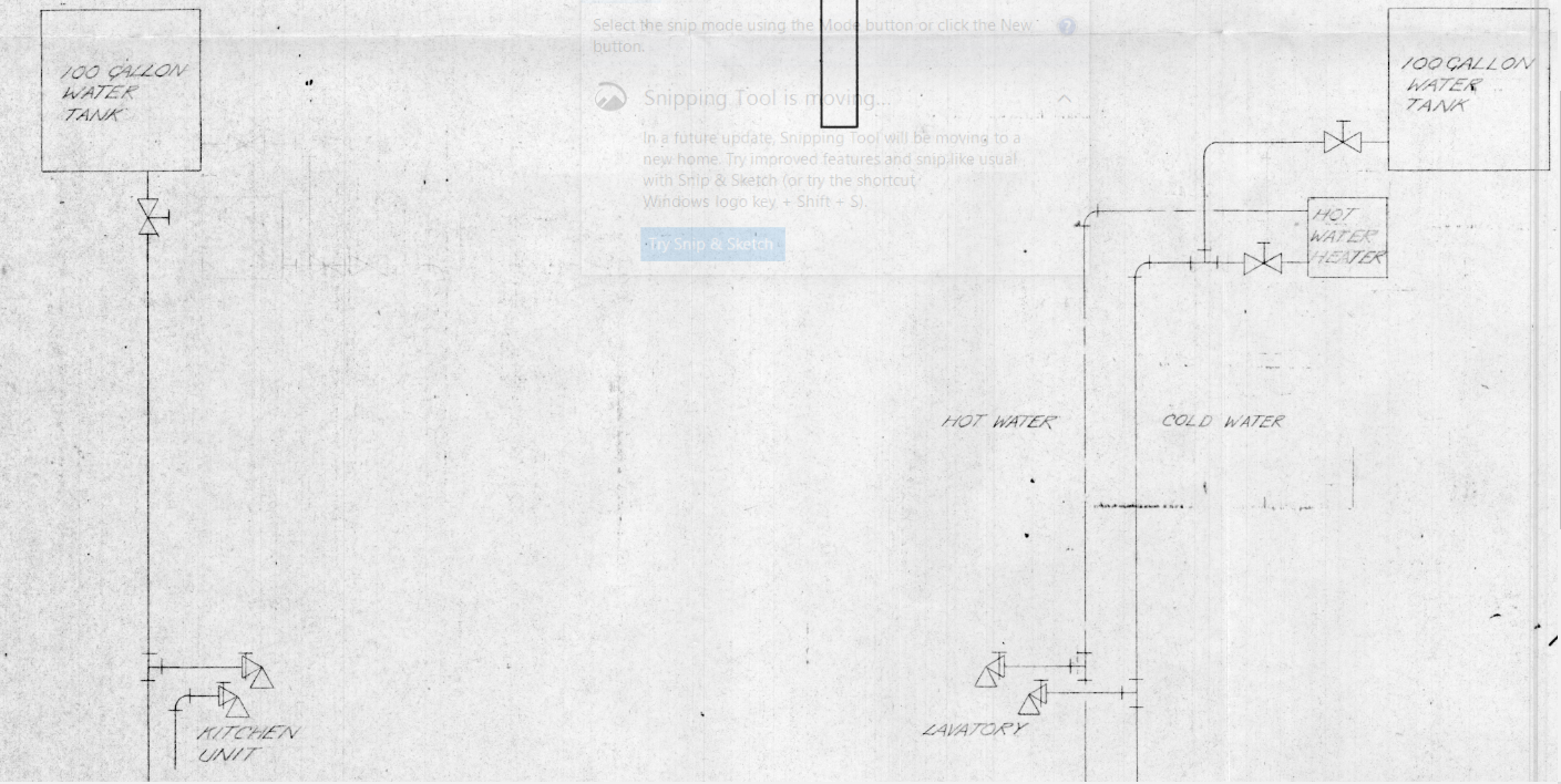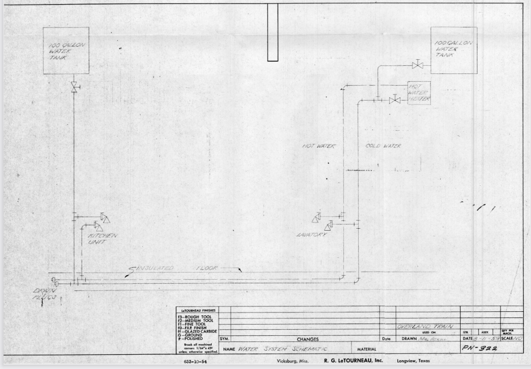 The Mark 2 contained 2*100 gallon water tanks. These tanks provided water under gravity to the hot water heater and the rest of the system. Water lines traveled underneath the insulated flooring. The drawing below shows that only one tank fed the hot water heater. Depending on the line pressure, it may be possible that the second 100-gallon tank could have also provided supply too. There is no mention or diagram of a wastewater system. It is entirely likely that the greywater from lavatory hand washing and the kitchen sink was drained outside as it was used.