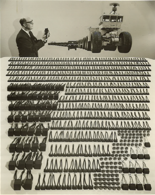 The last Overland Train, the Overland Mark II (Mk2), consisted of 13 cars – the leading Control Car, 10 Cargo Cars, and two trailing Power Cars. Each of the 54 wheels had its own wheel motor that used National Carbon Company brushes. A total of 668 brushes were needed to complete the Mk2 – 504 brushes were used in the traction motors within the wheels, 56 large brushes for the DC generators, 12 for the exciters, and 96 round items for AC generator contacts.