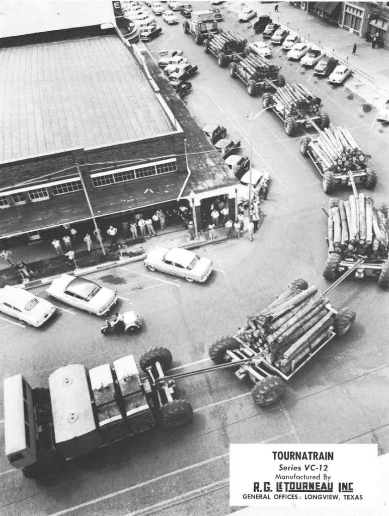 The VC-12 Tournatrain (VC-12) was R. G. LeTourneau’s second Overland Train. It consisted of 7 cargo cars and a control car. The VC-12 had two engines versus the single engine on the Tournatrain. It also featured a steering mechanism not seen on the previous train. But, that is for another day!