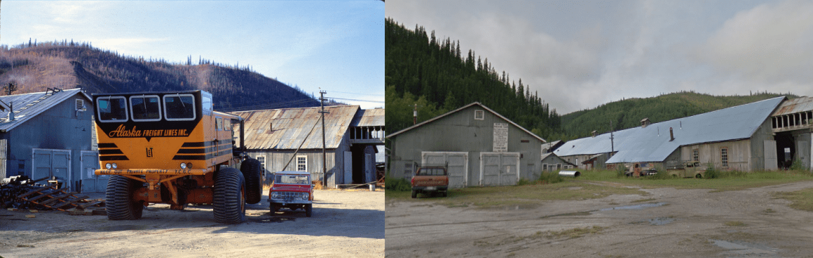 Bear Creek machine shop and the sno-freighter (left (image credit: the millen collection)) and the same location on google maps (right)
