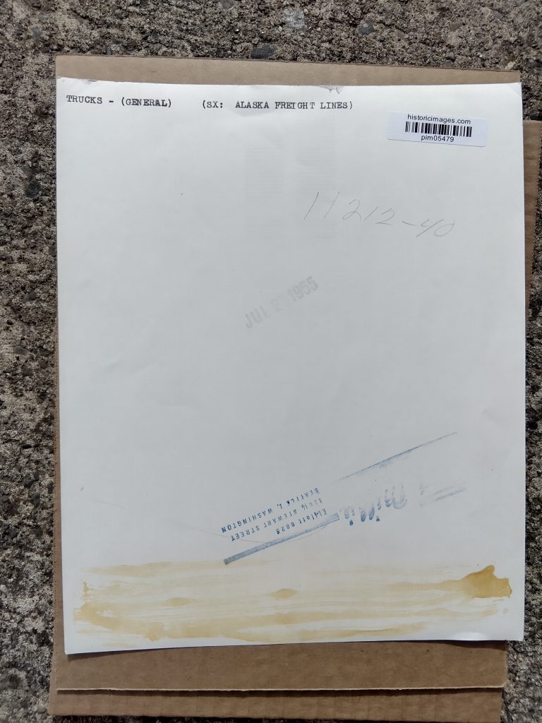 Coots and Historic Images are two online and historic photograph sources that I use to find these amazing relic photos. When you order their images, you receive tangible photos, oftentimes with some sort of metadata on the reverse. This particular image of the Sno-Freighter was dated July 25, 1955. At this time, the Sno-Freighter should be located at the mouth of the Blow River for the winter. It wasn’t until November of 1955, that it was retrieved and the catastrophic accident occurred.