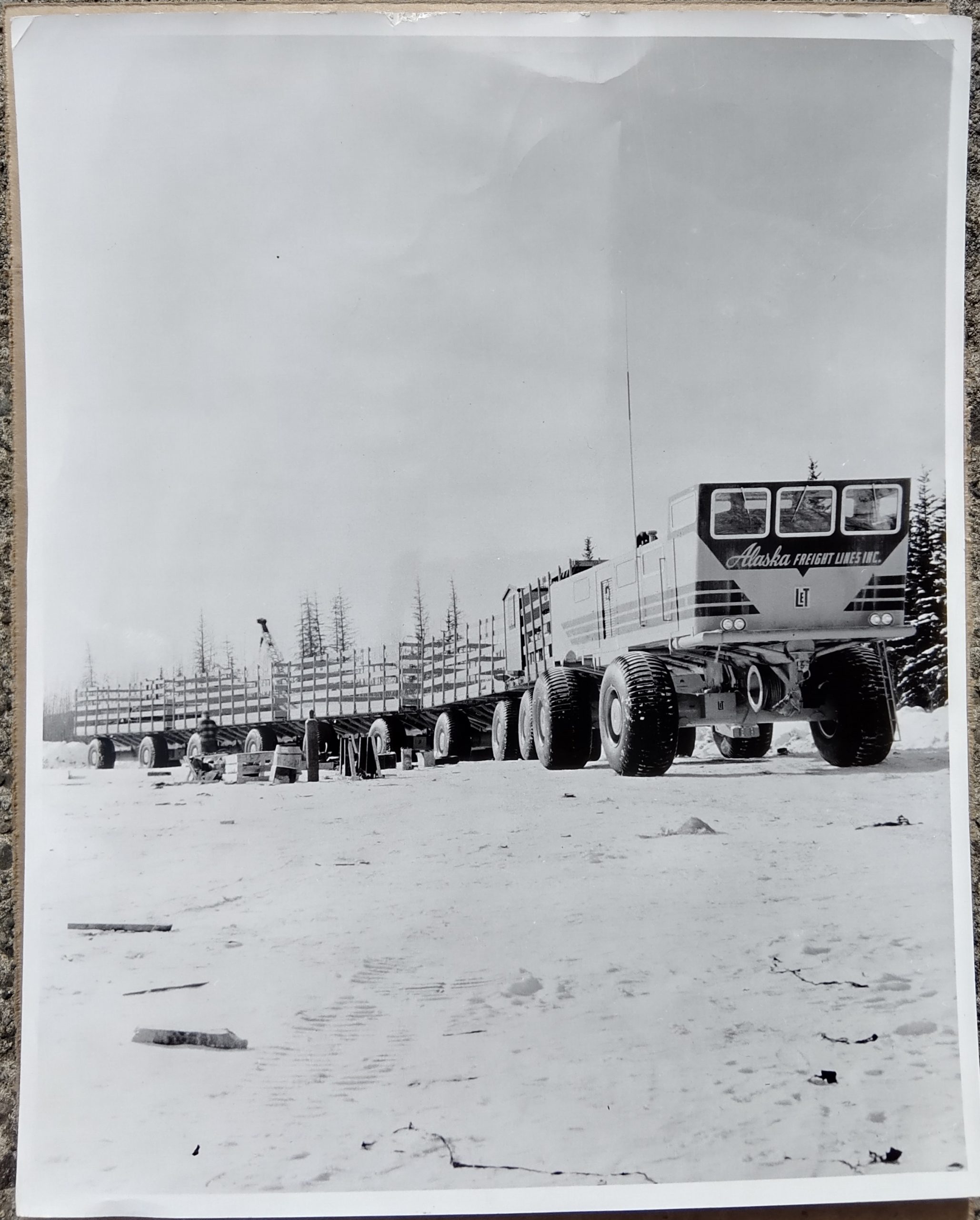 I received an image of the VC-22 Alaska Freight Lines Sno-Freighter Saturday, adding to my collection of historic images. To the left of the third trailer, you can zoom in and see a gas cylinder and an assortment of, what appear to be, wood boxes or crates. On the first trailer, there is a wannagan.