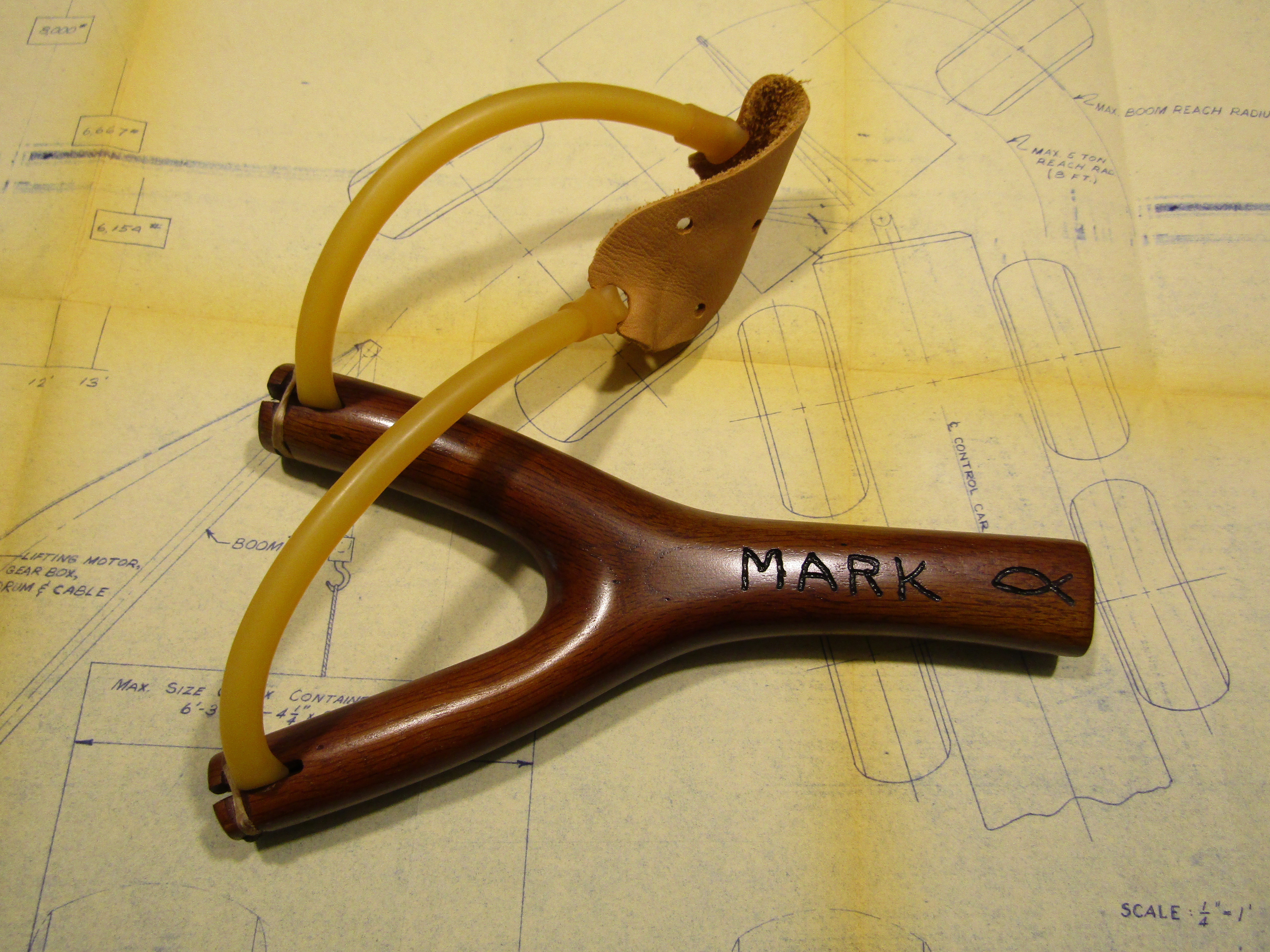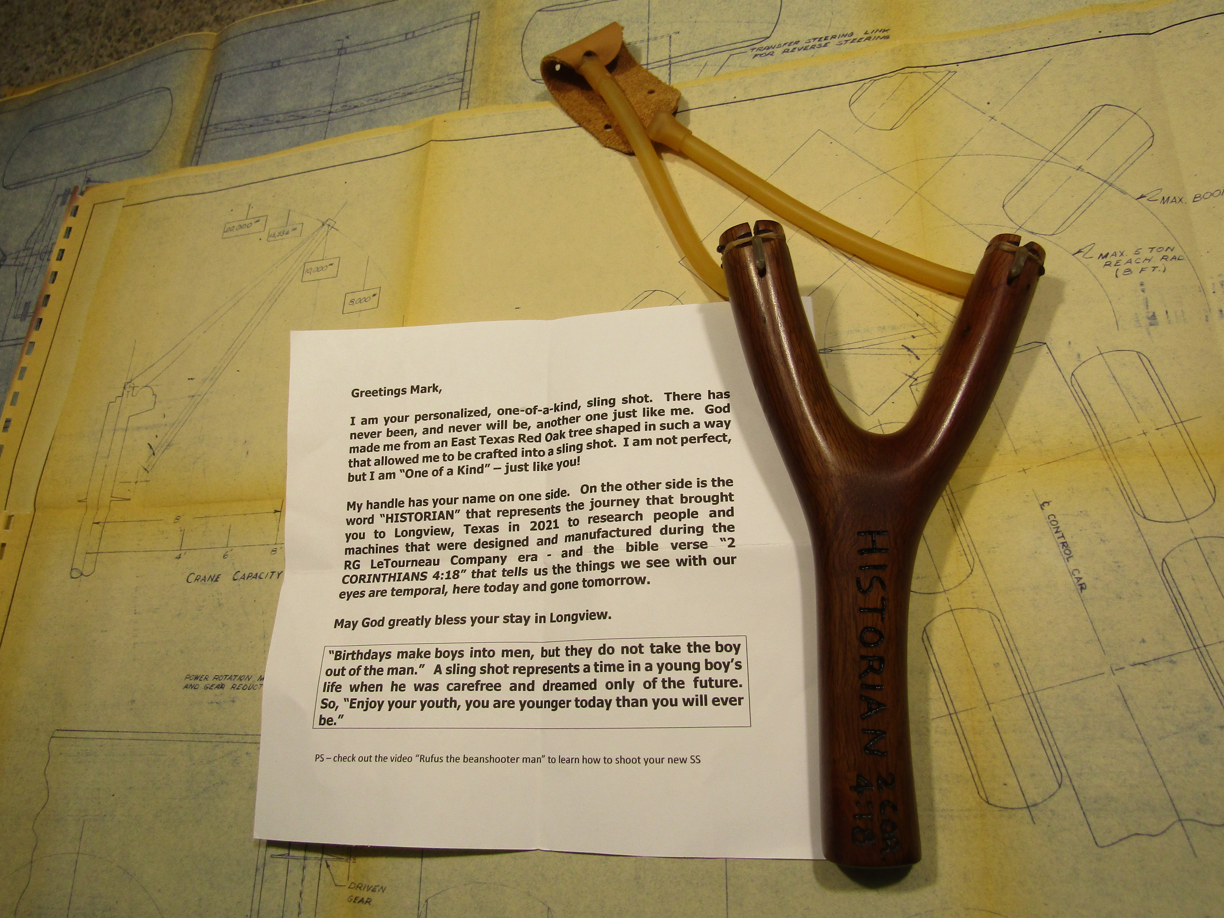During my trip to Texas last week, I interviewed a man who drafted the suspension components for the Overland Train MkII. The interview lasted only an hour. A couple of days later, we met up with another man who worked on the R.G. LeTourneau, Inc assembly line. During the 2 hour lunch, he gave me a custom slingshot. He makes these custom for each person that he deems worthy of his creations. This is built out of Red Oak and has custom engravings on each side.