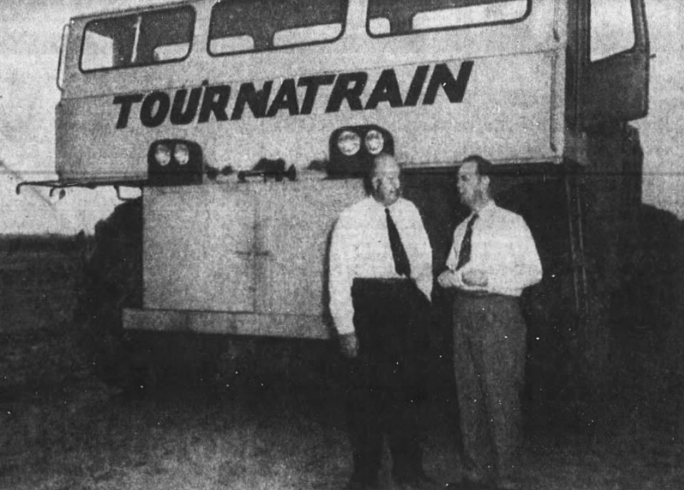 Tested in 1954, the VC-12 Tournatrain was R.G. LeTourneau’s second Overland Train. The VC-12 Tournatrain boasted two-450HP gasoline engines. The engines drove generators powering 32 electric wheels.