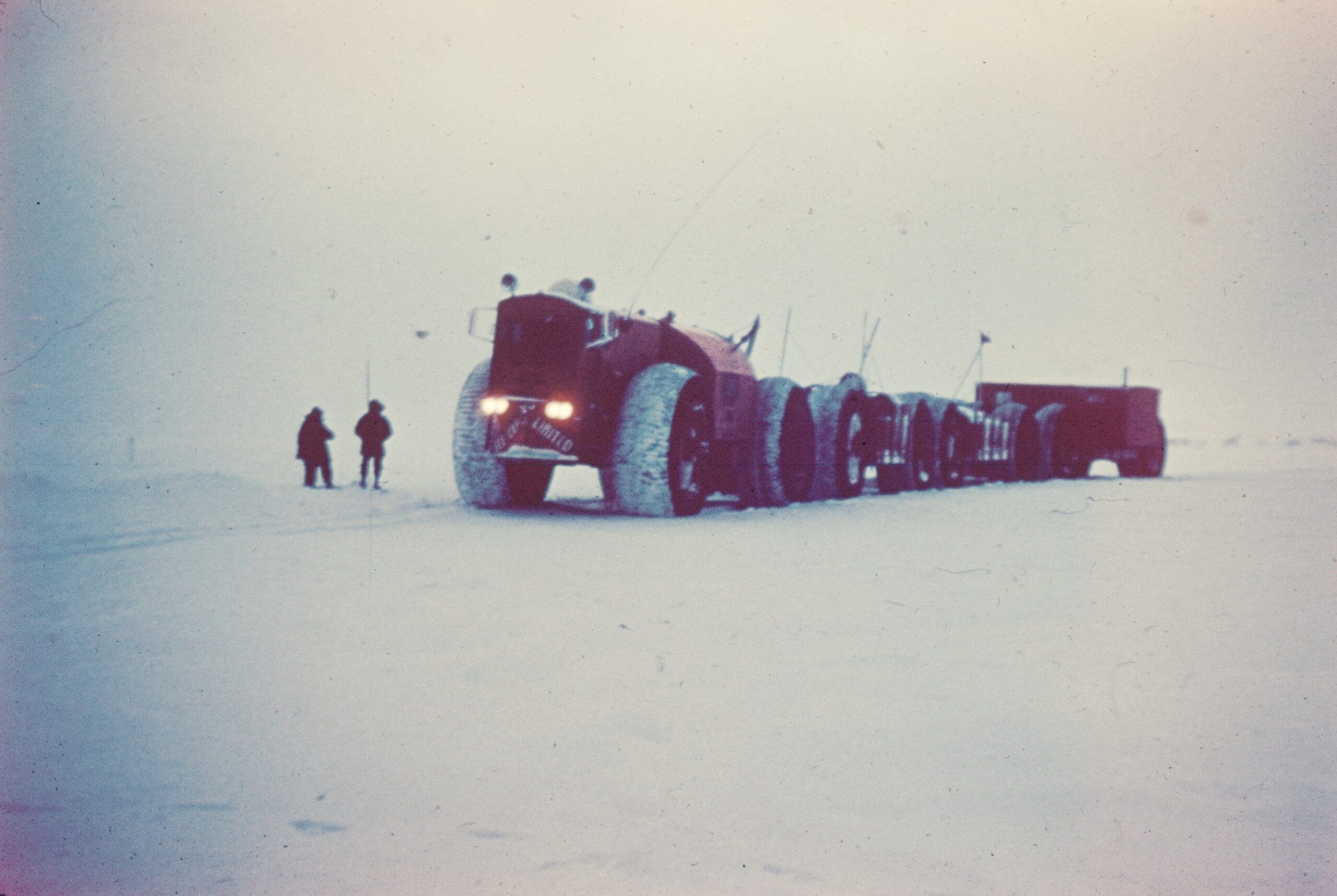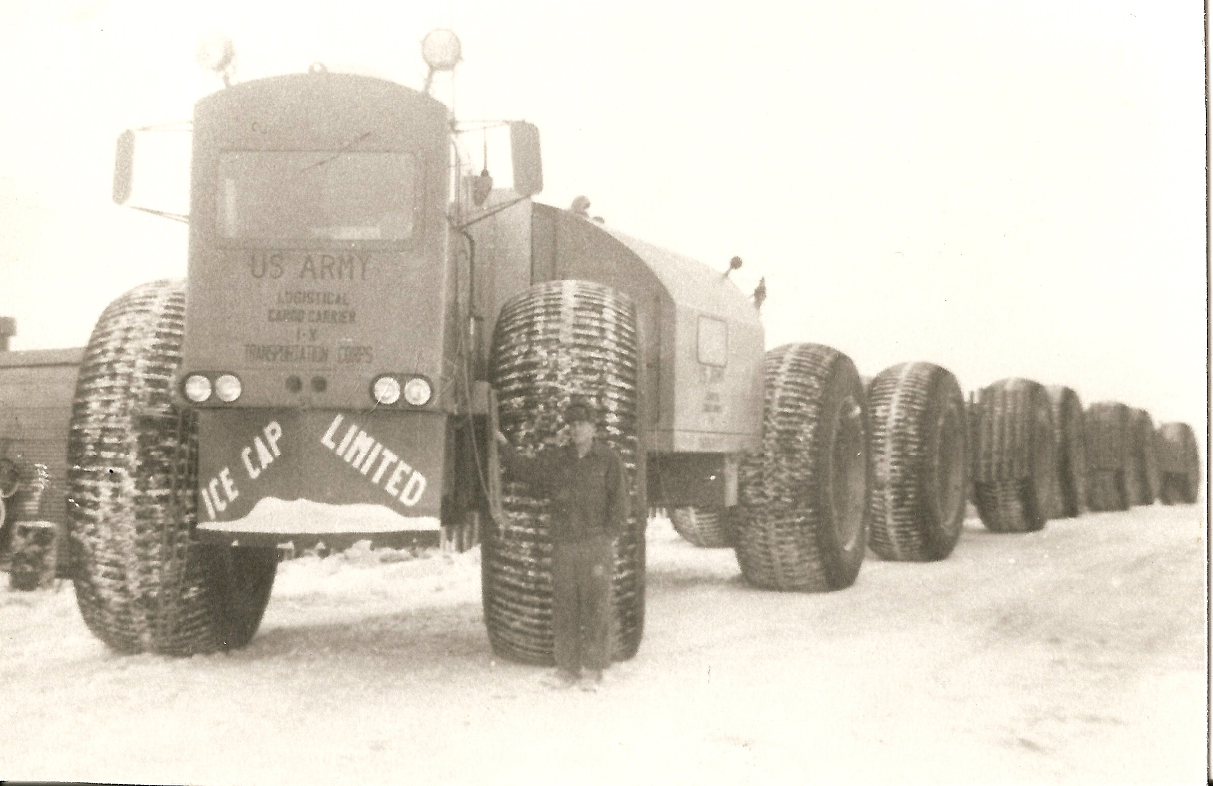 Above: One last image of the Sno-Train in Greenland with Arnold Haynes standing in front of the massive Firestone 120x48x68 tires.