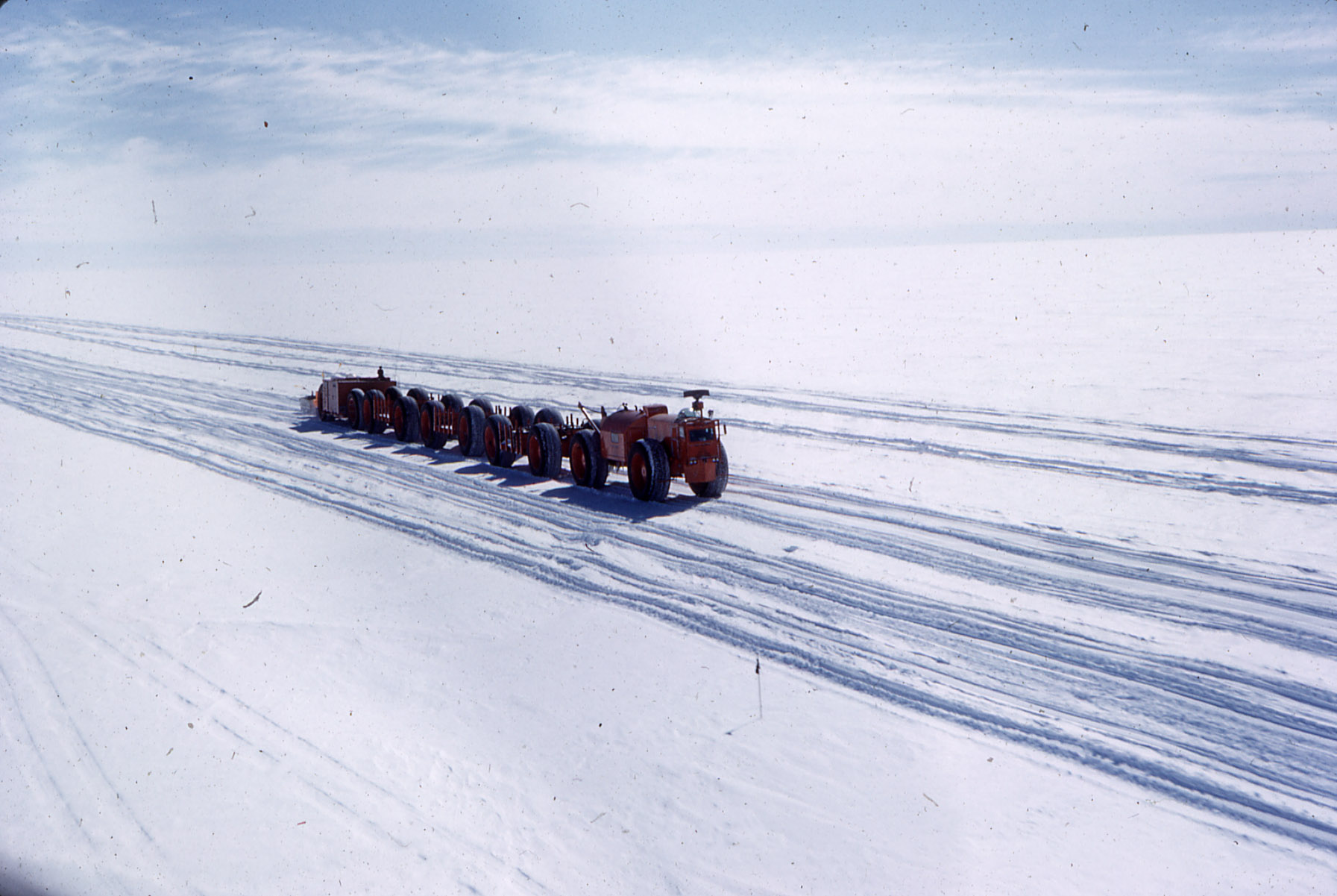 Above: The Sno-Train travels across the CAT train road with a Goodyear tired based Thompson Trailer towing what appears to be a wanigan. The horizontal bar atop the Sno-Train’s front car, or control car, is a radar unit.