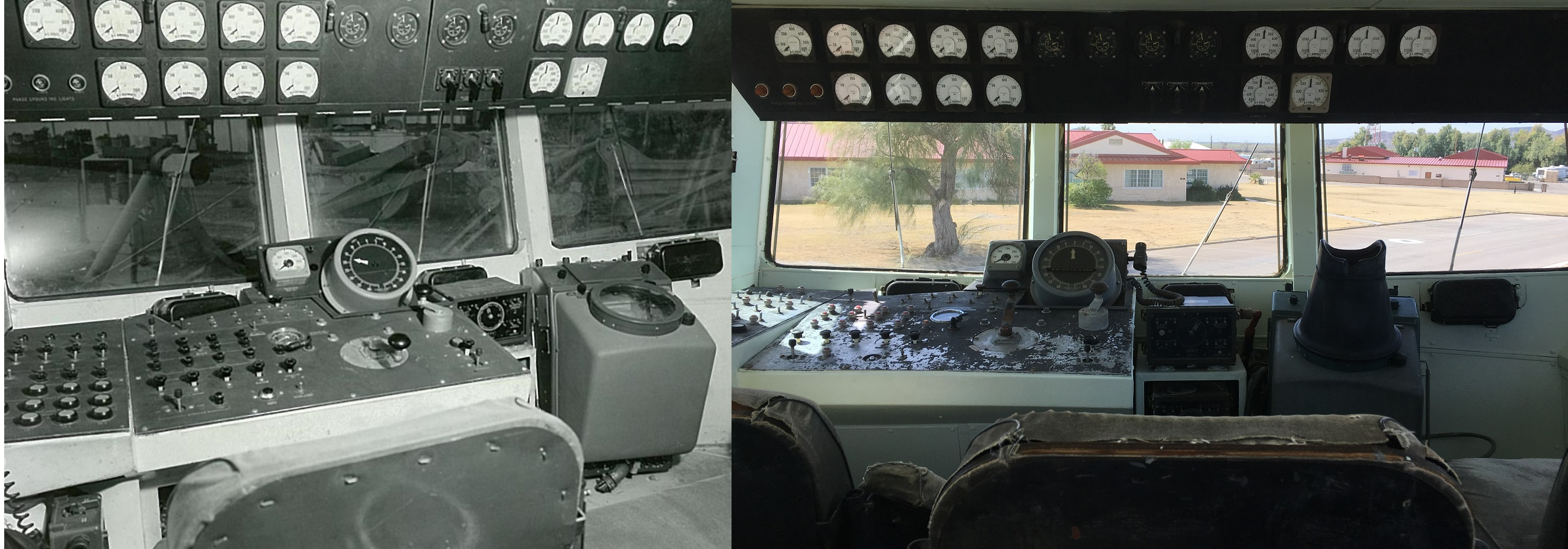 The tc-497’s Operator’s station: Image (left) shows the TC-497 interior while in the Longview Factory, Courtesy R. G. LeTOurneau Museum & archives at LeTourneau university; image (right) shows the same view after restoration at the yuma proving ground heritage center, courtesy of mark sandercock, US Army RET.